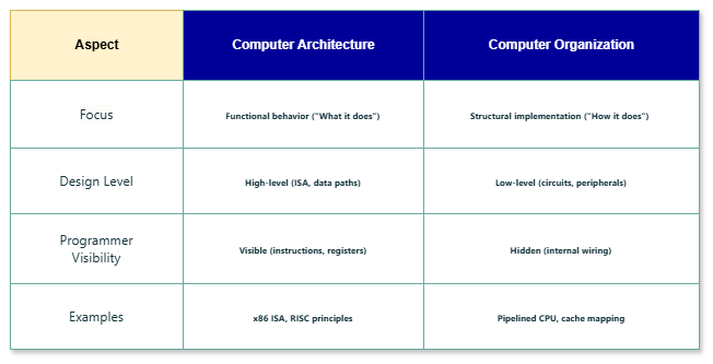 For example, it covers microarchitecture, like pipelining in Intel chips where instructions overlap for faster execution. This low-level focus ensures cost-efficiency and reliability but limits flexibility once built.