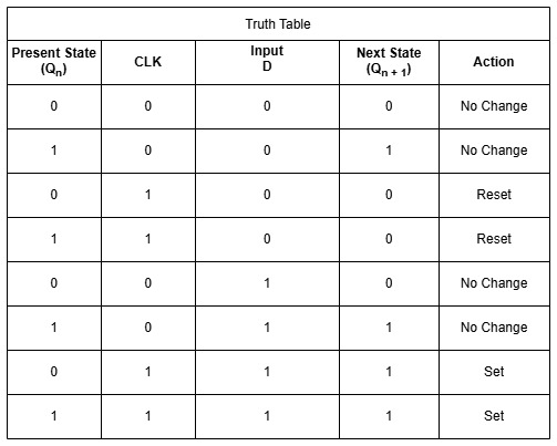 This means the SR flip-flop never receives an illegal “1,1” combination making it a new Flip Flop named D Flip Flop.