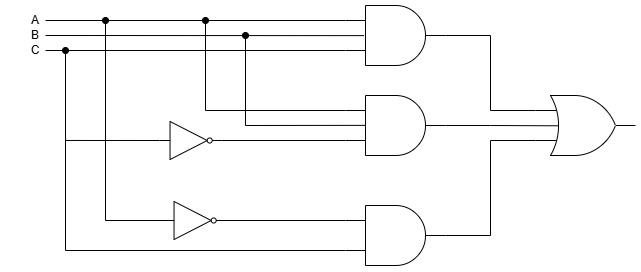 The logic diagram for the Boolean function ABC + ABC’ + A’C :