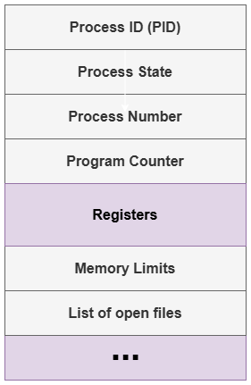 • CPU Registers: Includes values like general-purpose registers, stack pointer, index registers, etc., which store temporary data for running the process. Saved during context switches.