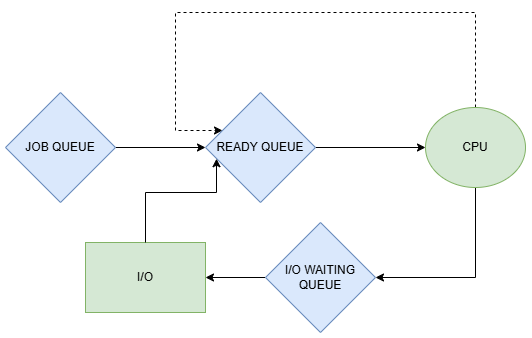 • Long-Term Scheduler (Job Scheduler): This one decides which new processes from the job queue get admitted into the ready queue and loaded into memory. It controls the overall number of active processes to avoid overwhelming the system, balancing CPU-heavy and I/O-heavy jobs for steady performance. It runs infrequently, like when a user submits a batch, and aims for a mix that keeps utilization high without overload.