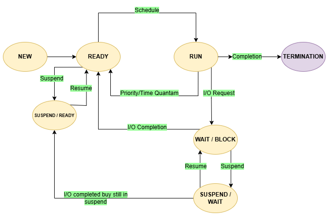 Suspended Waiting State: Similar to waiting, but paused on disk due to low memory. It moves to waiting once reloaded.