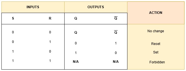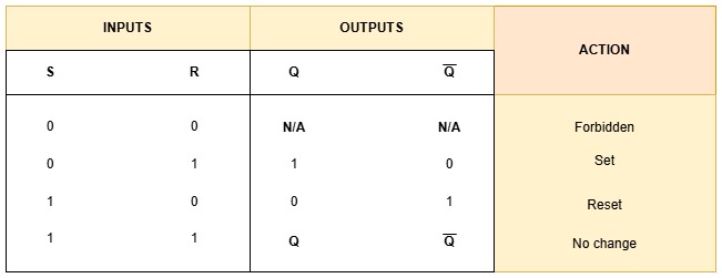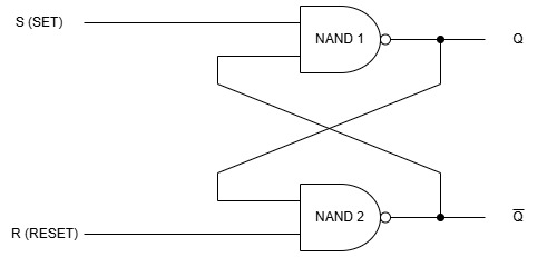 The inputs are S (set) and R (reset) and the outputs are Q and Q̅ (the complement of Q).